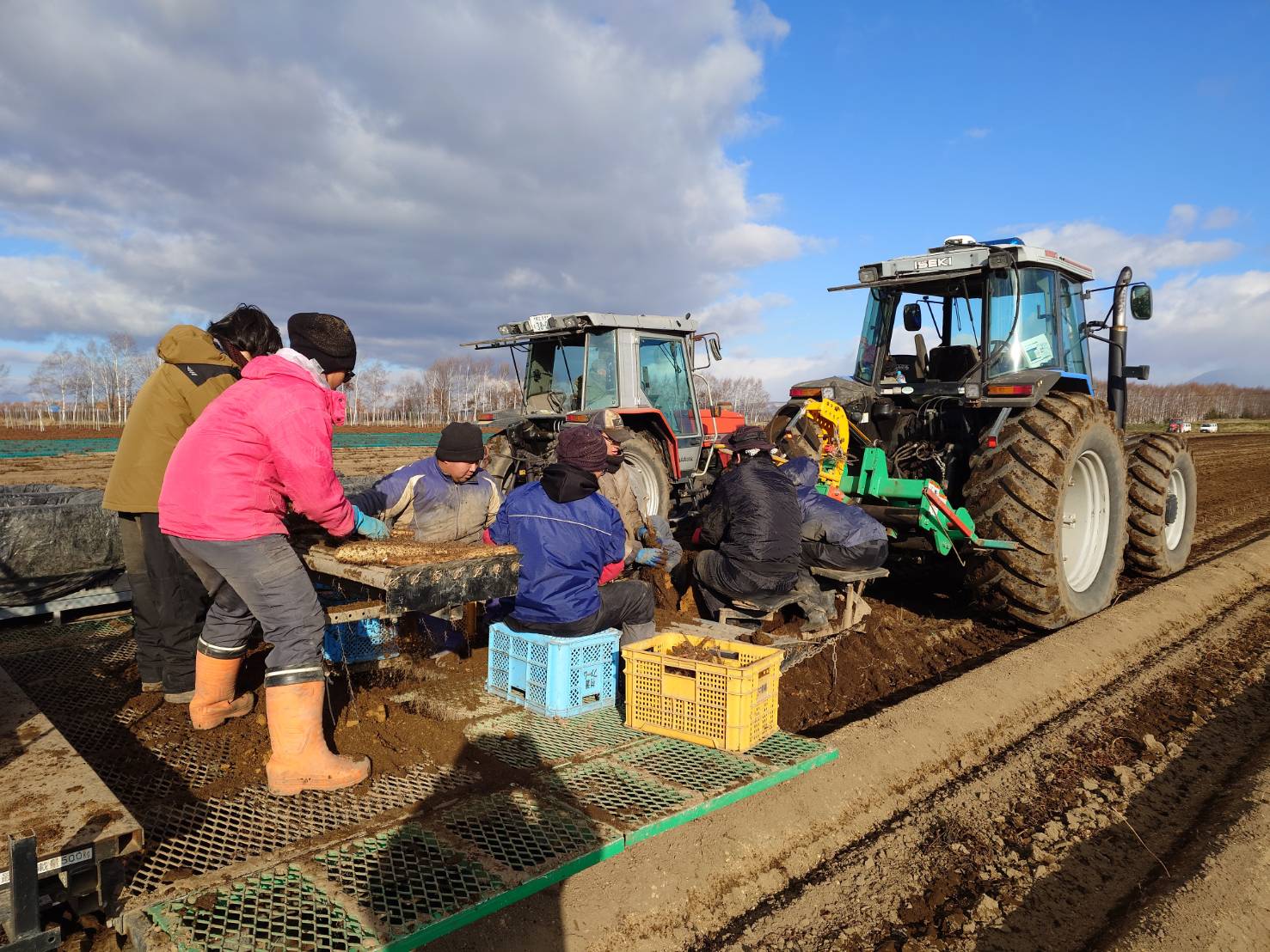 青空の下、せっせせっせと芋を収穫してコンテナに運んでは砂を落とし、根を落とし、選別してはコンテナに運ぶ。休憩をはさみながら永遠と右腕左腕、腹筋、背筋を酷使する作業です。